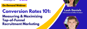 Recruitment Marketing Conversion Rates 101: JobSync & Dalia Webinar At JobSync, we recently had the pleasure of hosting a webinar with Dalia, where we discussed Conversion Rates 101: Measuring & Maximizing Top-of-Funnel Recruitment Marketing. Sam Fitzroy, Co-Founder and CEO of Dalia, and Leah Daniels, COO of JobSync, took a fun and candid look at the... Read more »